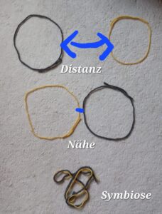 Meist beruhen sie auf frühkindlichen Erfahrungen, die von Verlust, Ablehnung, Bindungstrauma oder emotionaler Unsicherheit geprägt waren. Menschen gehen dann in die Symbiose, wie die unteren verschlungenen Bindfäden auf dem Bild oder bleiben permanent in großem Abstand, so wie die Kreise im oberen Teil des Bildes – obwohl sie sich nach Nähe sehnen. Aber diese Nähe ist mit Angst verbunden.